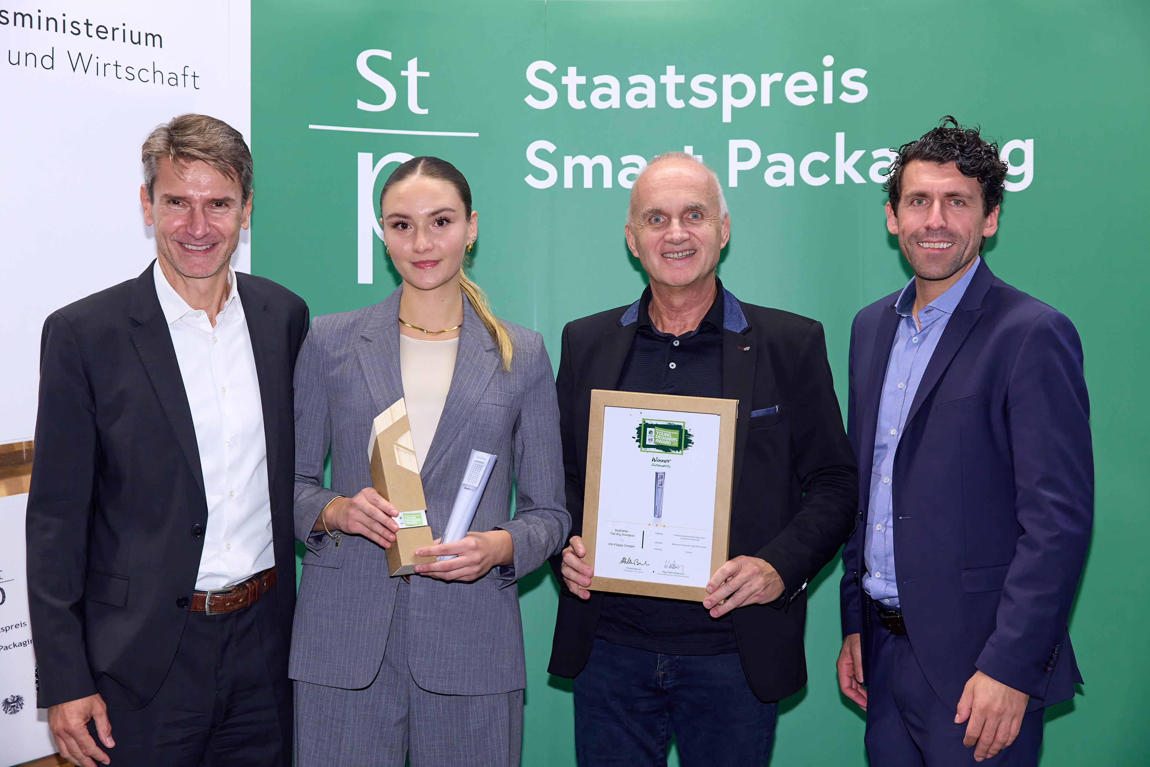 Verleihung des Staatspreises Smart Packaging 2024 in der Kategorie B2C an Pratopac GmbH und claro products GmbH für Kartonstreudose Auf dem Foto: Sarah Warscher (BMK), Daniel Spirig und Alexander Abbrederis (pratopac), Roland Weinert (BMAW) © BMAW/Silveri