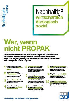Die gemeinsame Verpflichtung zum nachhaltigen Handeln gegenüber der Umwelt, der Gesellschaft und der Wirtschaft wurde in der PROPAK Nachhaltigkeits-Charta festgehalten. Die industriellen Hersteller von Produkten aus Papier und Karton streben bei allen Tätigkeiten nach größtmöglicher Nachhaltigkeit in diesen drei Bereichen.